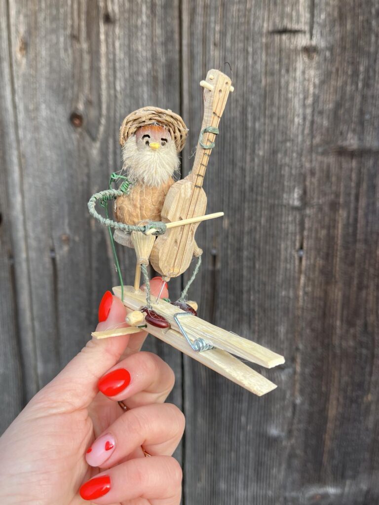 Ruchoma zabawka – mechanizm na bazie drewnianego spinacza do bielizny. Po naciśnięciu spinacza grajek wprawia w ruch instrument.