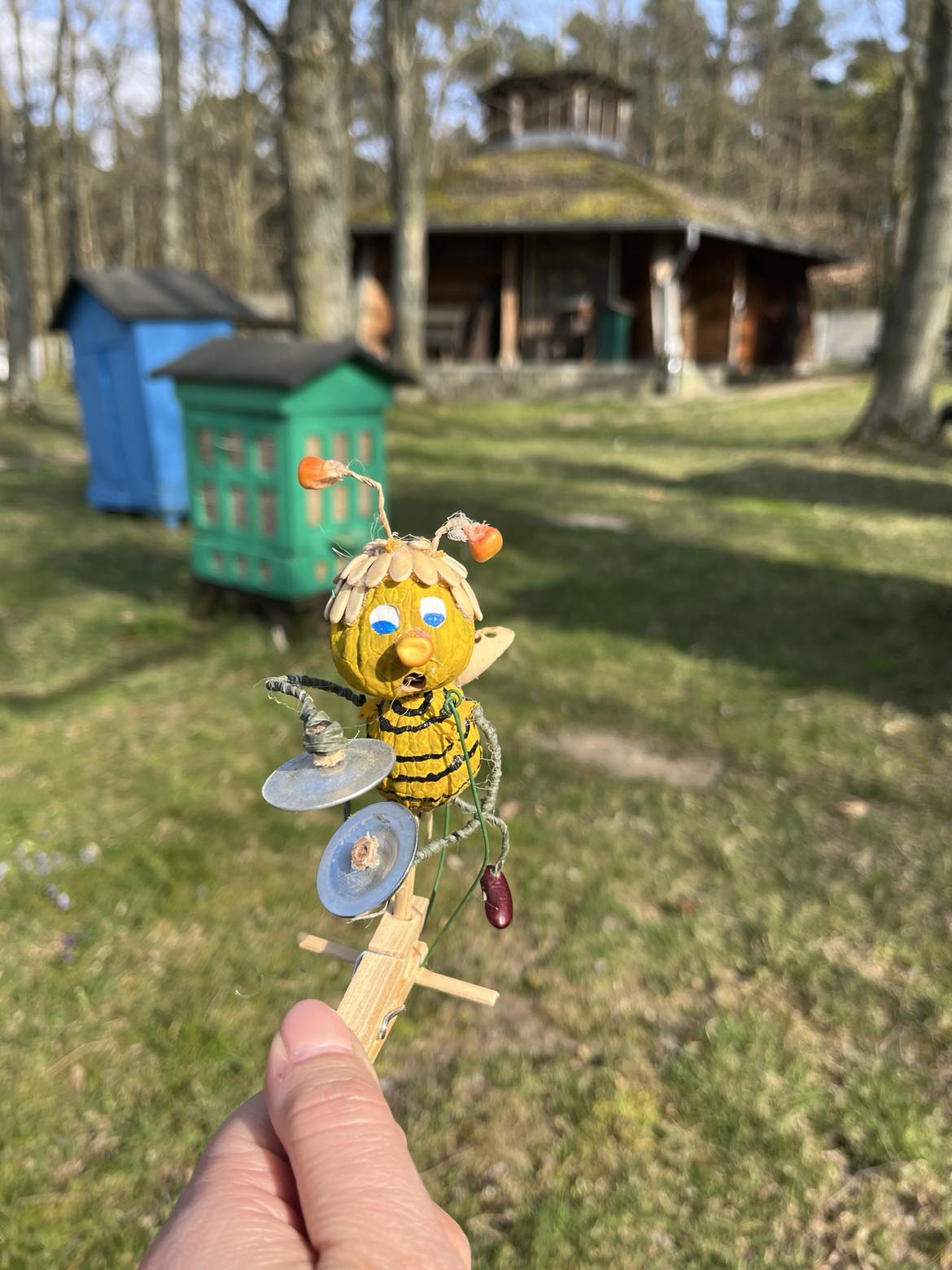 Ruchoma zabawka – mechanizm na bazie drewnianego spinacza do bielizny. Po naciśnięciu spinacza Pszczółka gra na instrumencie.